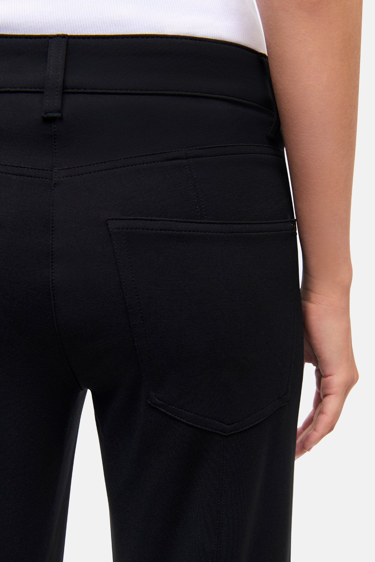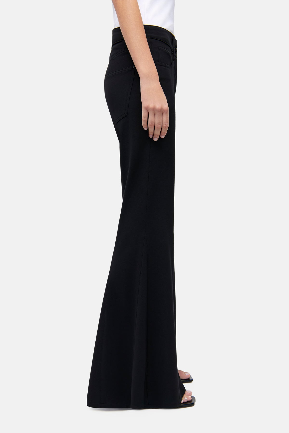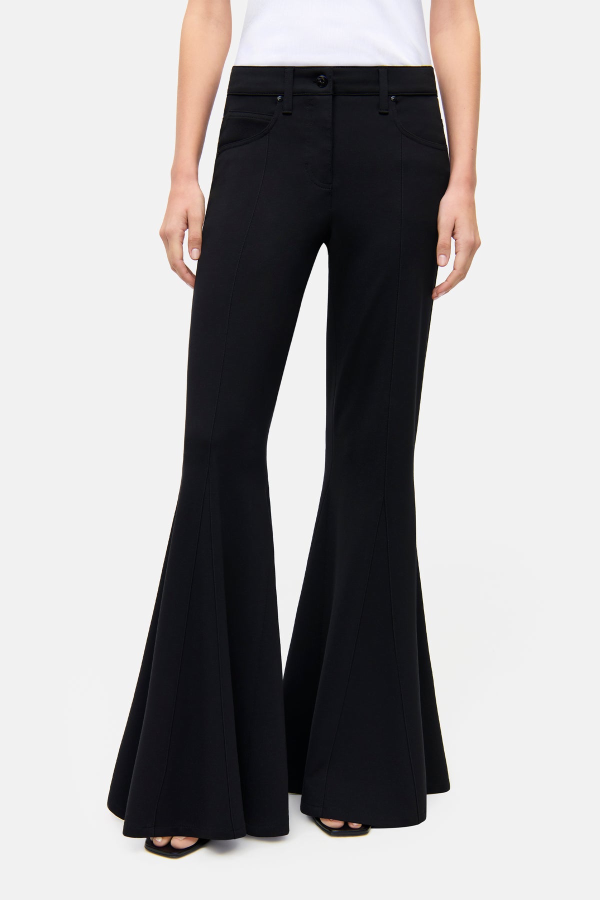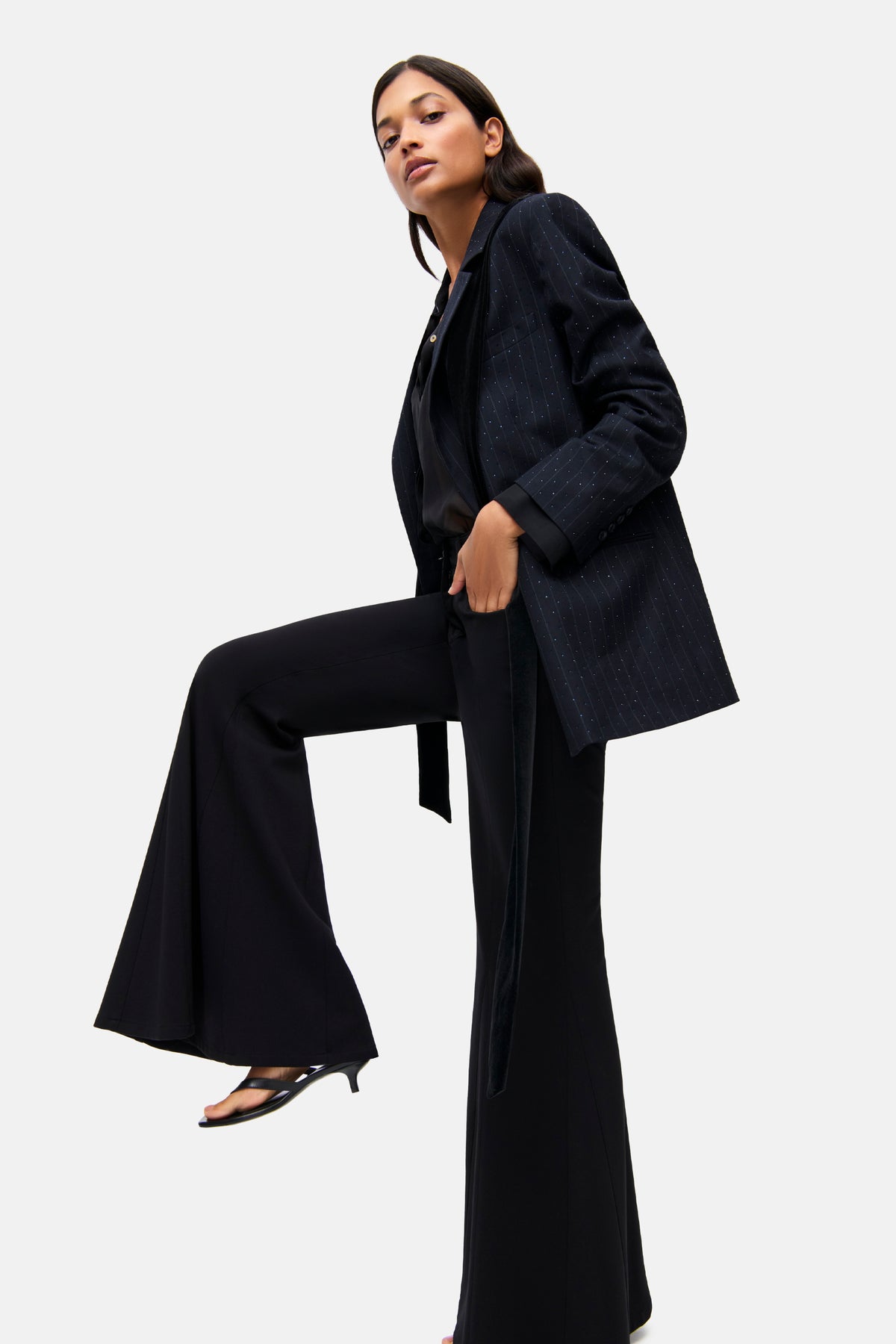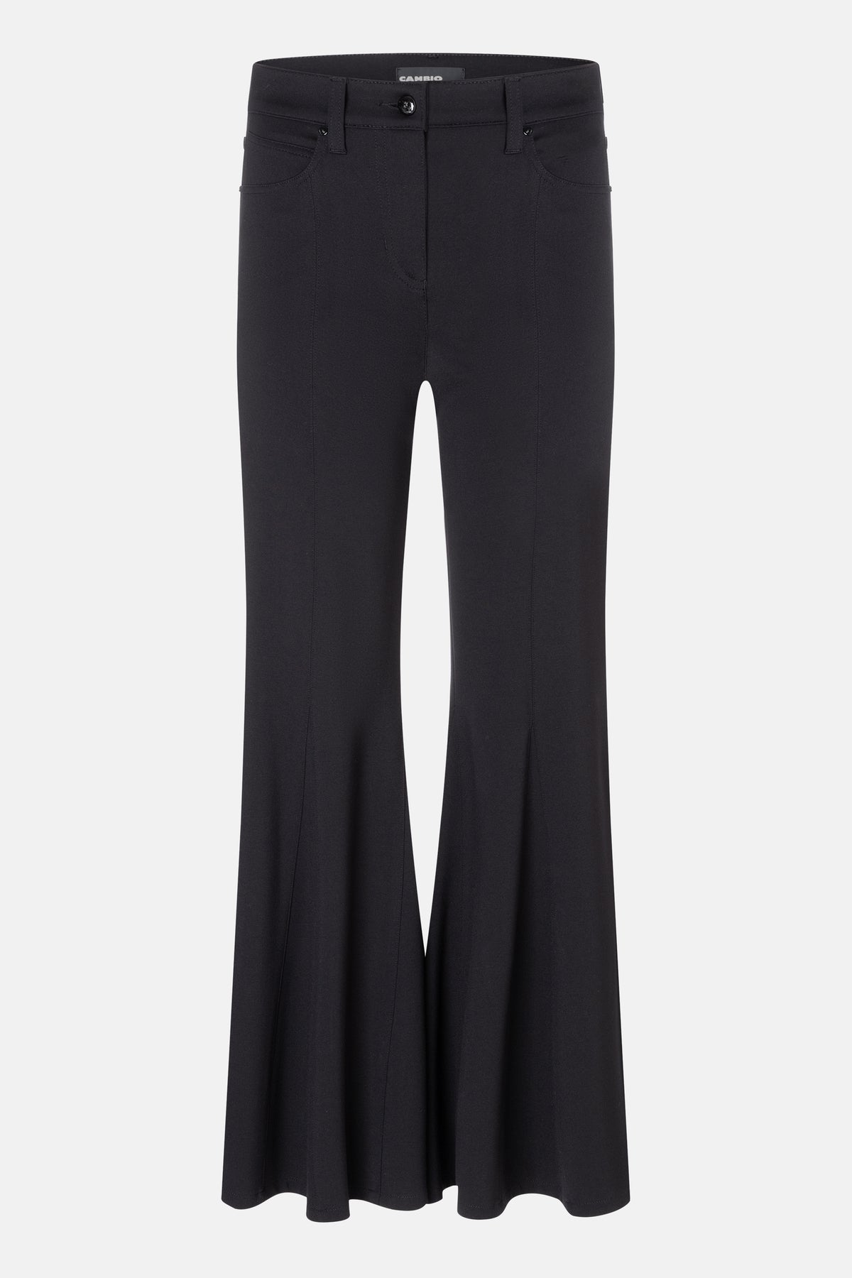 Flared Hose FLAIR in Full Length. Die schwarze Hose überzeugt mit ihrem leichten, fließenden Punto-Milano-Material, das durch hohe Elastizität, Formstabilität und angenehmen Tragekomfort besticht. Die Jersey-Qualität sorgt für eine perfekte Passform, die sich harmonisch an den Körper anschmiegt. Das stark ausgestellte Bein setzt ein modisches Statement und verleiht der Hose einen modernen, chicen Look – ideal für die festliche Saison und stilsichere Auftritte.
