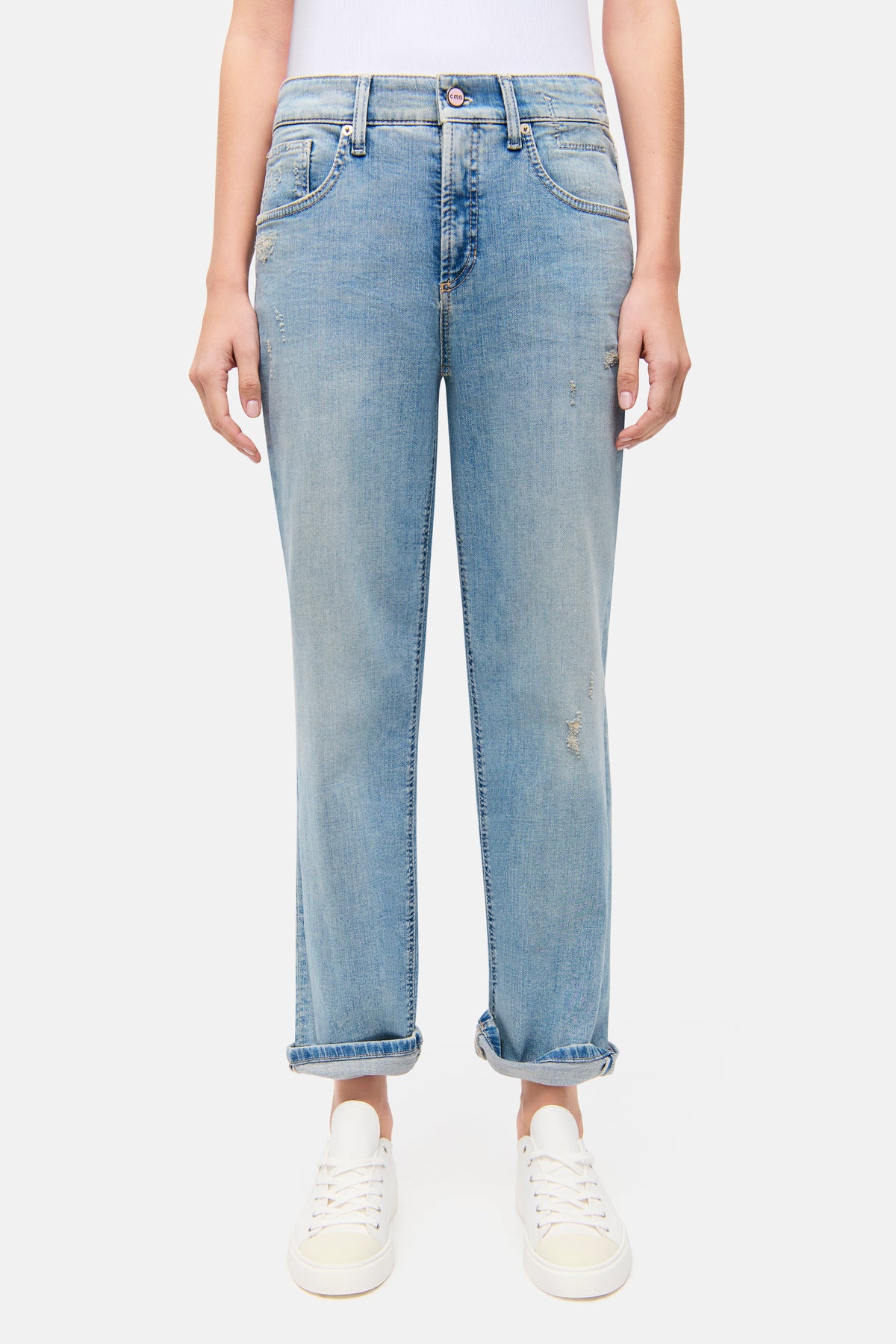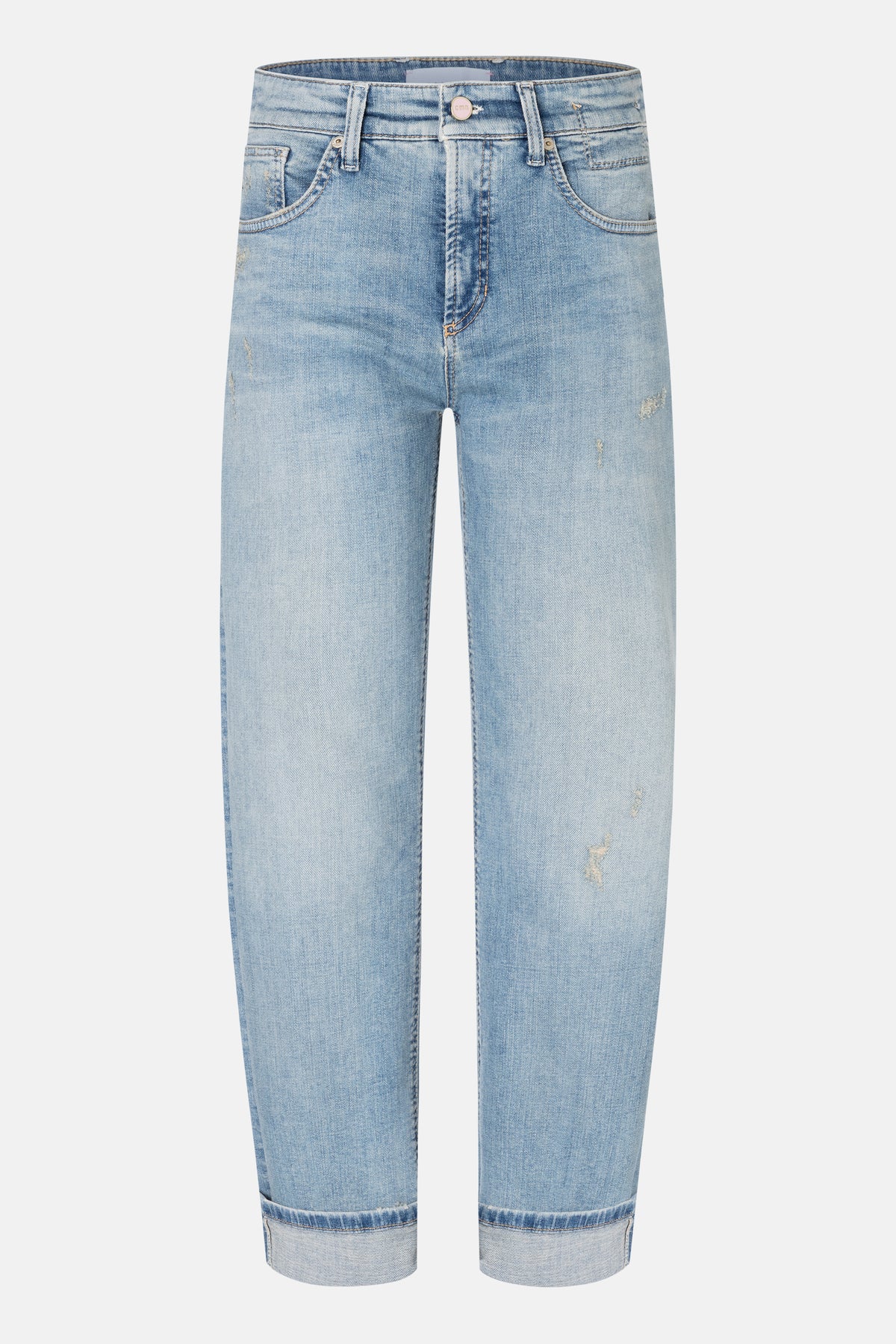 Straight-fit jeans GAIA RELAXED in full length. These jeans impress with their soft super-stretch denim, which adapts comfortably and offers optimal freedom of movement. The light wash gives the style a modern, casual look, while distressed details add a cool, urban touch. Pink accents such as the button and back label add a fresh, feminine touch. The turned-up hem can be worn open depending on how you style it – for versatile, individual looks.