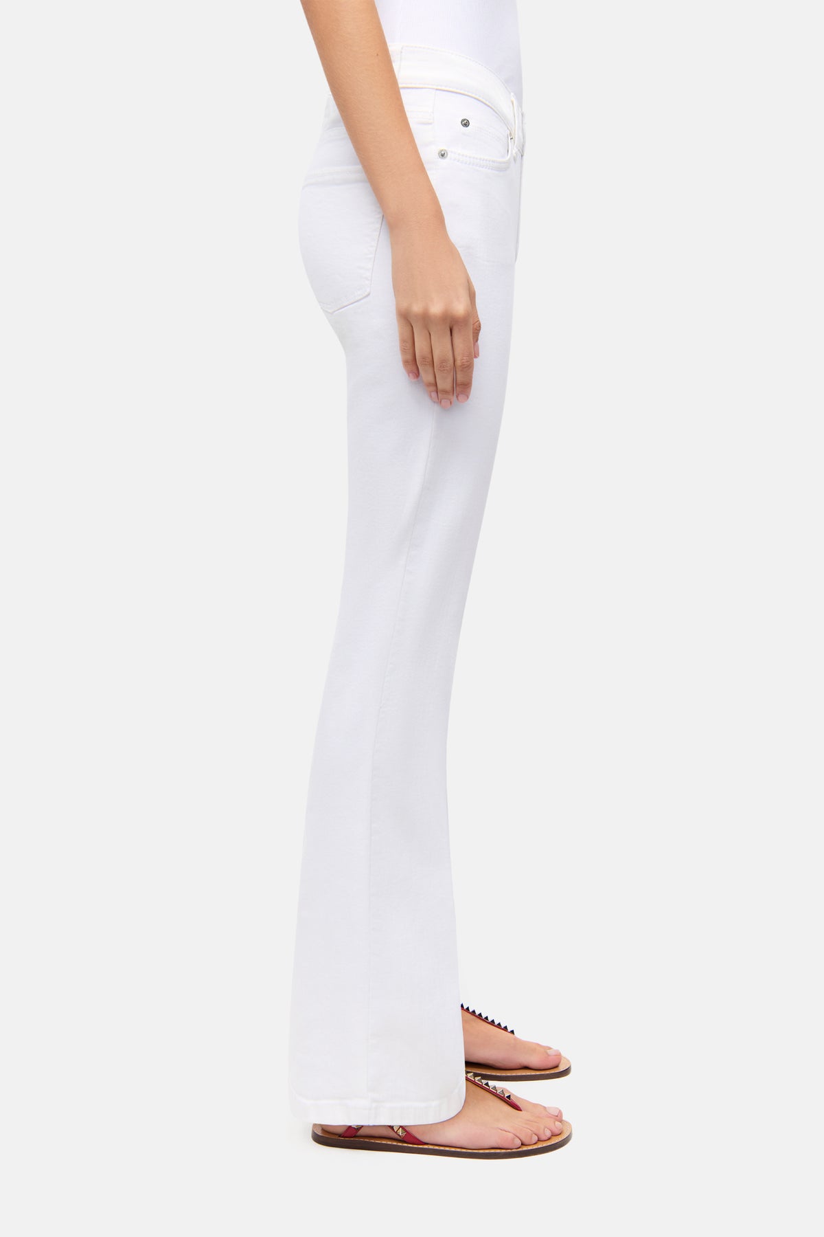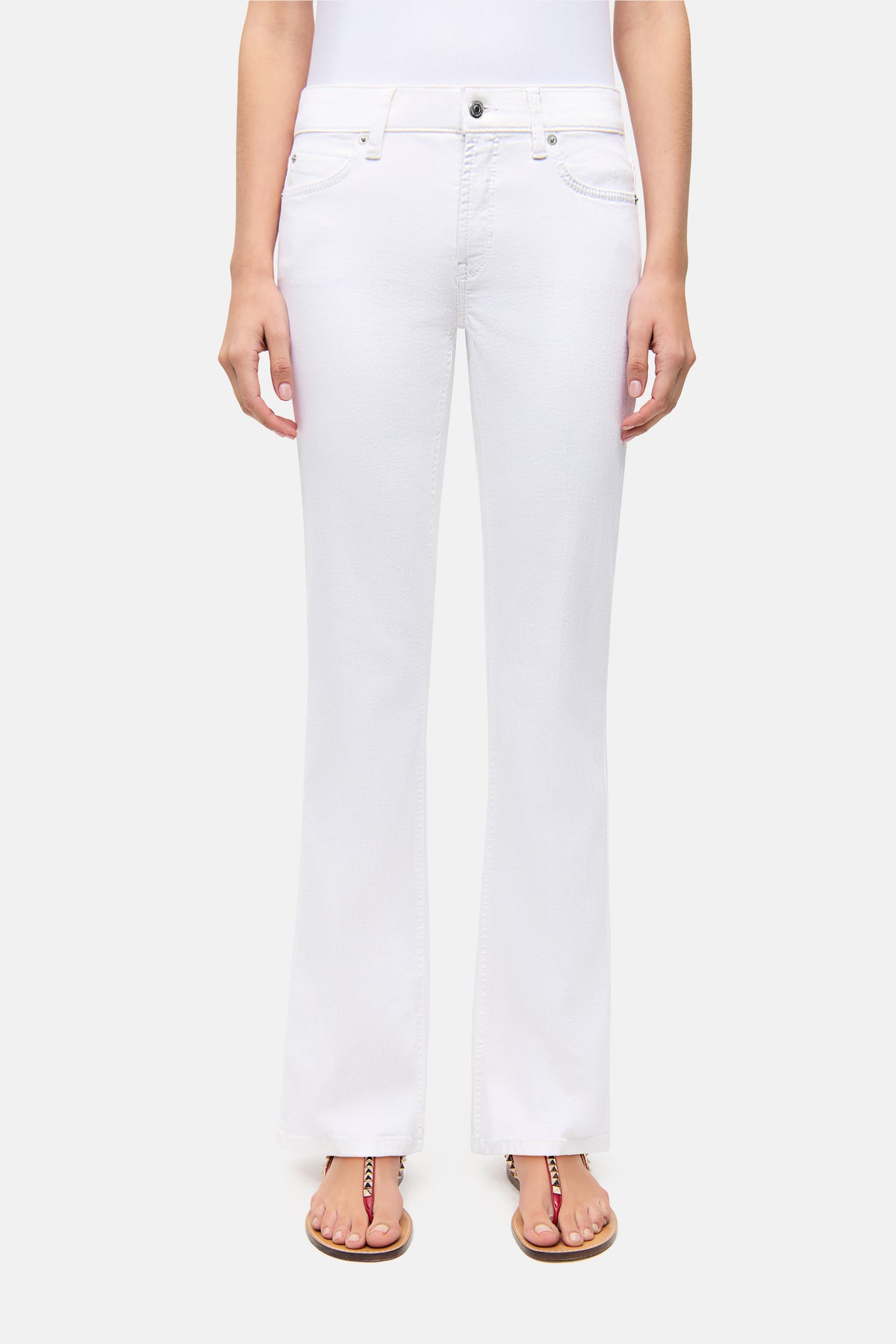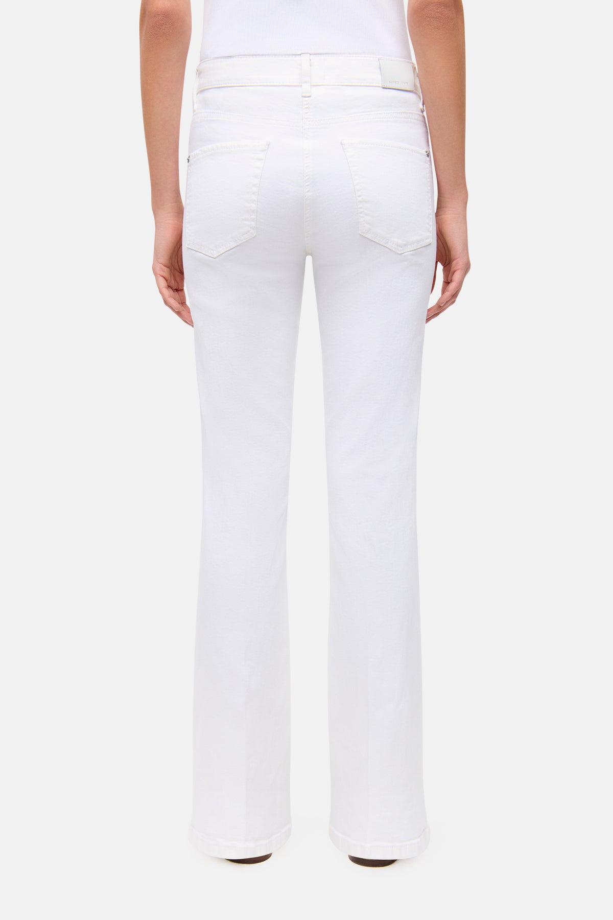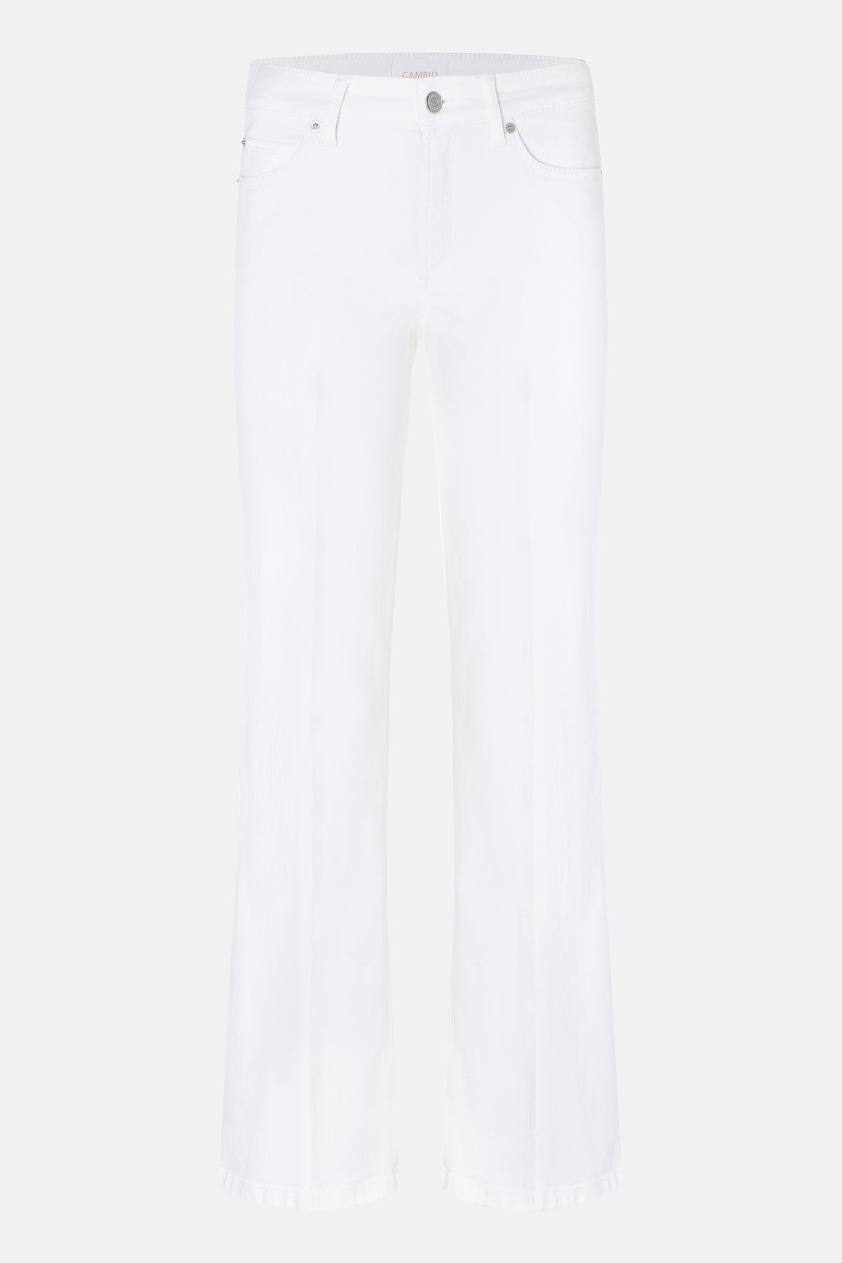 PARIS FLARED flared jeans in full length. These jeans impress with their modern flared silhouette, which flatters the figure while offering a relaxed, summery look. The white wash creates a fresh, light feel, while silver details add a stylish touch. The soft denim with a touch of elastane provides exceptional comfort, optimal freedom of movement, and a pleasant feel. The classic 5-pocket design completes the timeless look.