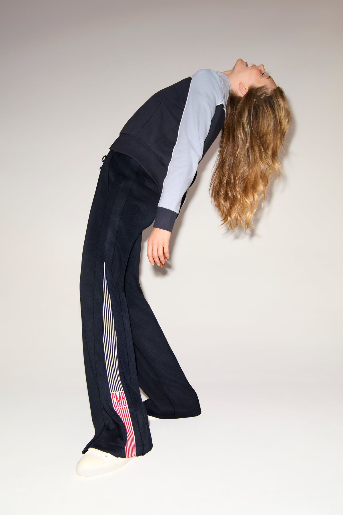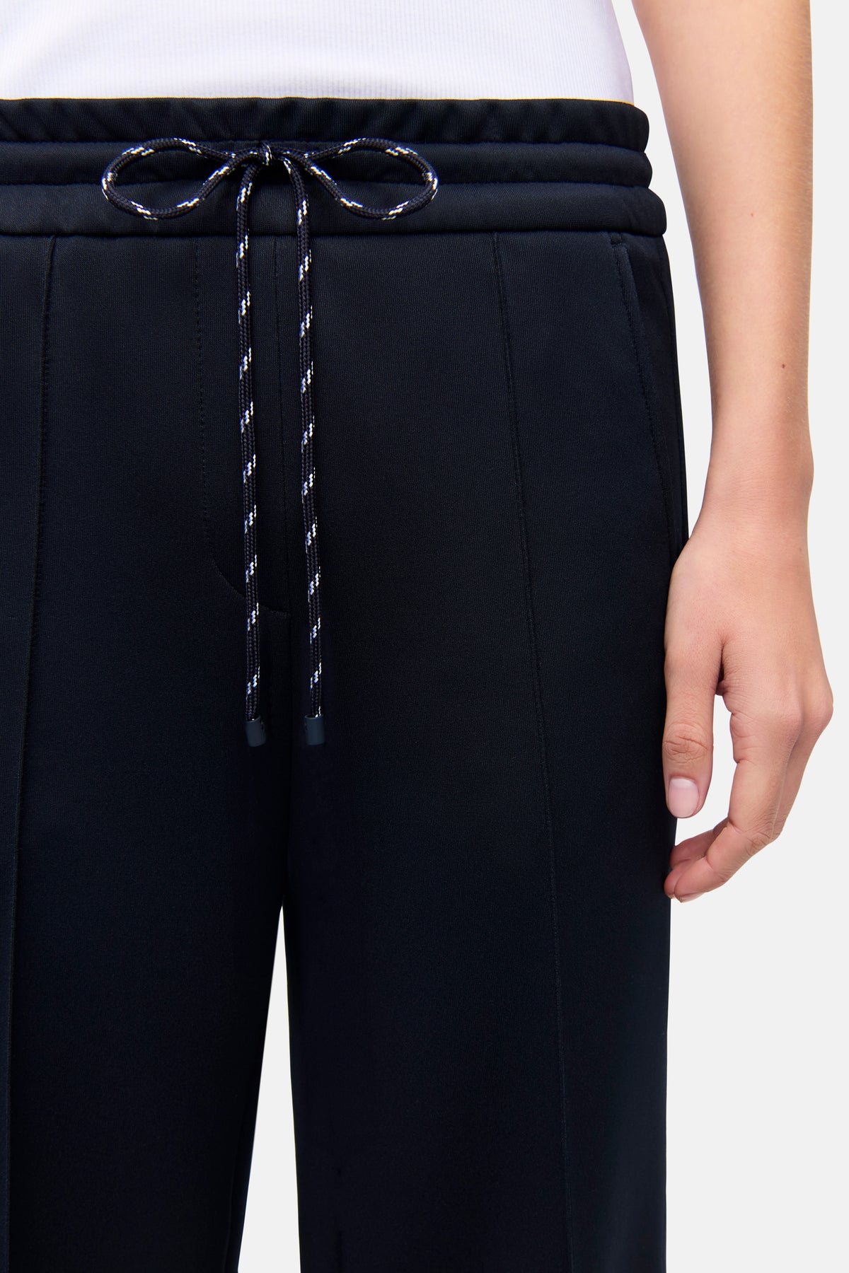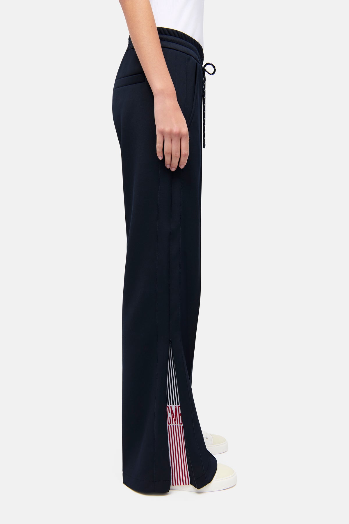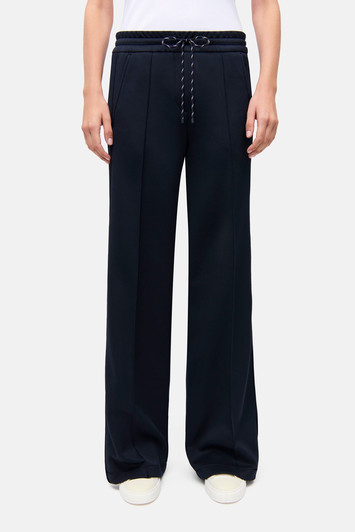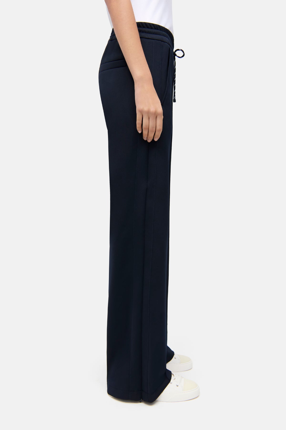 Wide-leg trousers AMELIA in full length, navy. These trousers impress with a modern wide-leg silhouette and a relaxed, flowing drape – perfect for a stylish athleisure or loungewear look. A striking drawstring and side stripes that can be opened with a zipper give the design a contemporary twist. The high-quality neoprene jersey is exceptionally stretchy, wrinkle-resistant, and easy to care for, while the subtle sheen elegantly highlights the navy color. Comfort meets fashion statement here.